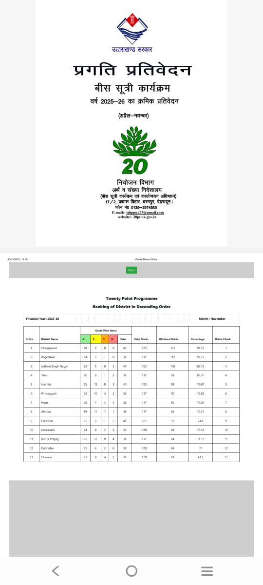 ज्योति प्रसाद गैरोला जी ने बताया कि बीस सूत्रीय कार्यक्रम में प्रत्येक माह का रिपोर्ट पत्र जारी किया जाता है जिसमें सभी जिलों के कार्यों की प्रगति रिपोर्ट सूचीबद्ध की जाती है।